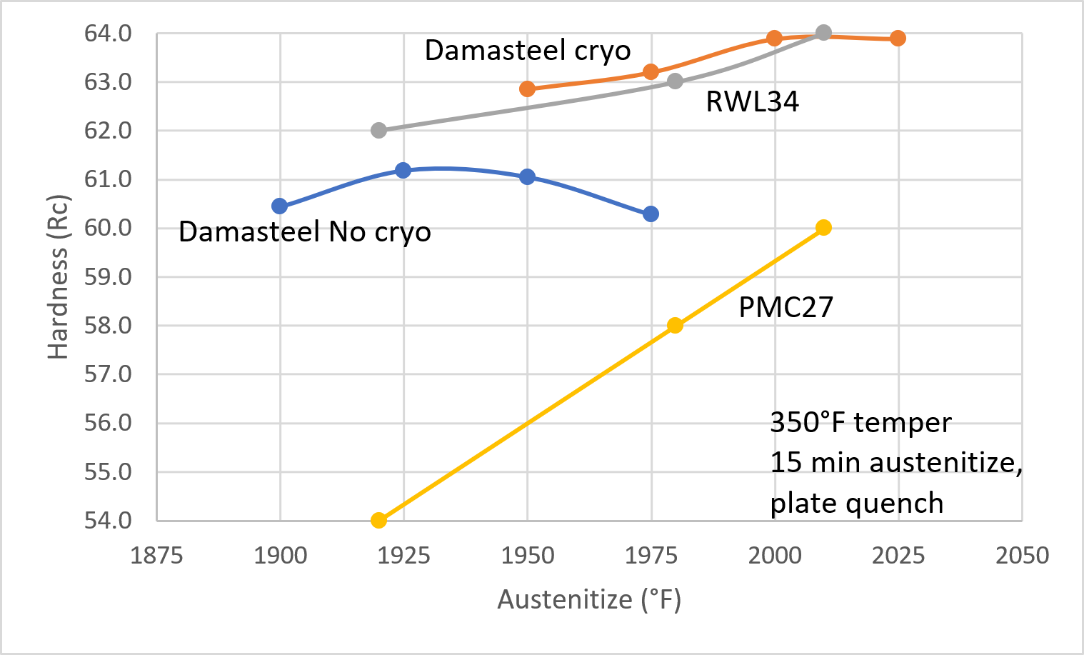 Hardness values are listed for RWL34 and PMC27 for each of the five heat treatment conditions but it does not specify whether this assumes a cold treatment or a room temperature quench. Whether the cold treatment is included has a strong effect on these final values. Another interesting aspect is that rather than giving a final hardness for the “DS93X” Damasteel combination of the two steels, instead it gives hardness values separately for RWL34 and PMC27, presumably so that the knifemaker can select a heat treatment that works for both alloys. Also the PMC27 look rather low when compared with the data on 12C27 from Sandvik [2][3] as shown on the chart I created below. The RWL34 values are much more in line with reported heat treatment data from Hitachi ATS-34, Latrobe 14-4CrMo, and my own experiments with CPM-154.