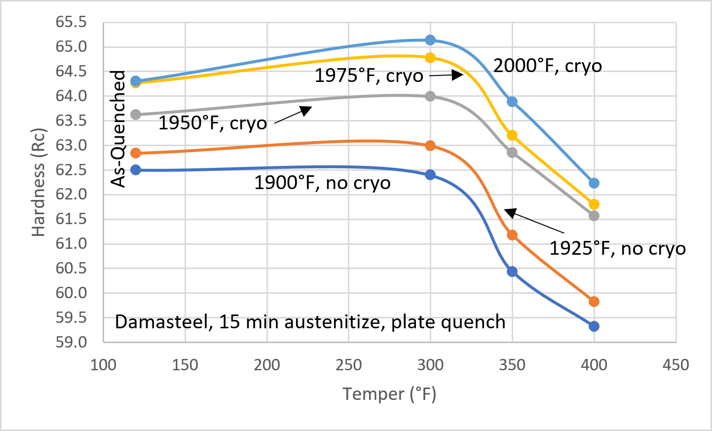 So why does the steel heat treat like RWL34 if roughly half of the steel is PMC27? The reason is because the two steels do not behave the same as when the two are heat treated separately. When combining two steels in Damascus, contrast is achieved after etching because the alloy contents are different, in this case the biggest difference is in the 4% Mo in the RWL34 which makes that steel resist etching better than the PMC27 which creates the bright layer. However, carbon is a very small “interstitial” element (between the iron atoms), which means it diffuses very rapidly. During the forge welding and forging process the carbon equalizes between the two steels, changing the heat treatment behavior of the two steels. It is slightly more complicated than this because some carbide will still be present in the CPM-154 even at a high forging temperatures such as 2150°F. So the carbon that will equalize will be the carbon “in solution” for the two steels at the forge welding and forging temperature. Using ThermoCalc for that temperature I estimate that RWL34 loses about 0.1% carbon while PMC27 gains about the same amount, resulting in the RWL34 having 0.95% carbon and PMC27 having 0.7% carbon. In this case, the resulting “carbon in solution” of the two steels during austenitizing ends up being very similar to the original RWL34, and thus the hardness values of PMC27 on its own are basically irrelevant to the heat treatment. This would make the PMC27 roughly the same composition as AEB-L, which also has its peak austenitizing temperature at 1925°F without cryo and 1975-2000°F with cryo (see this article). Instead it would be better if the datasheet just showed the resulting hardness data for heat treating the “DS93X” combination of the two steels. Below I have shown a heat treatment summary from my own experiments: