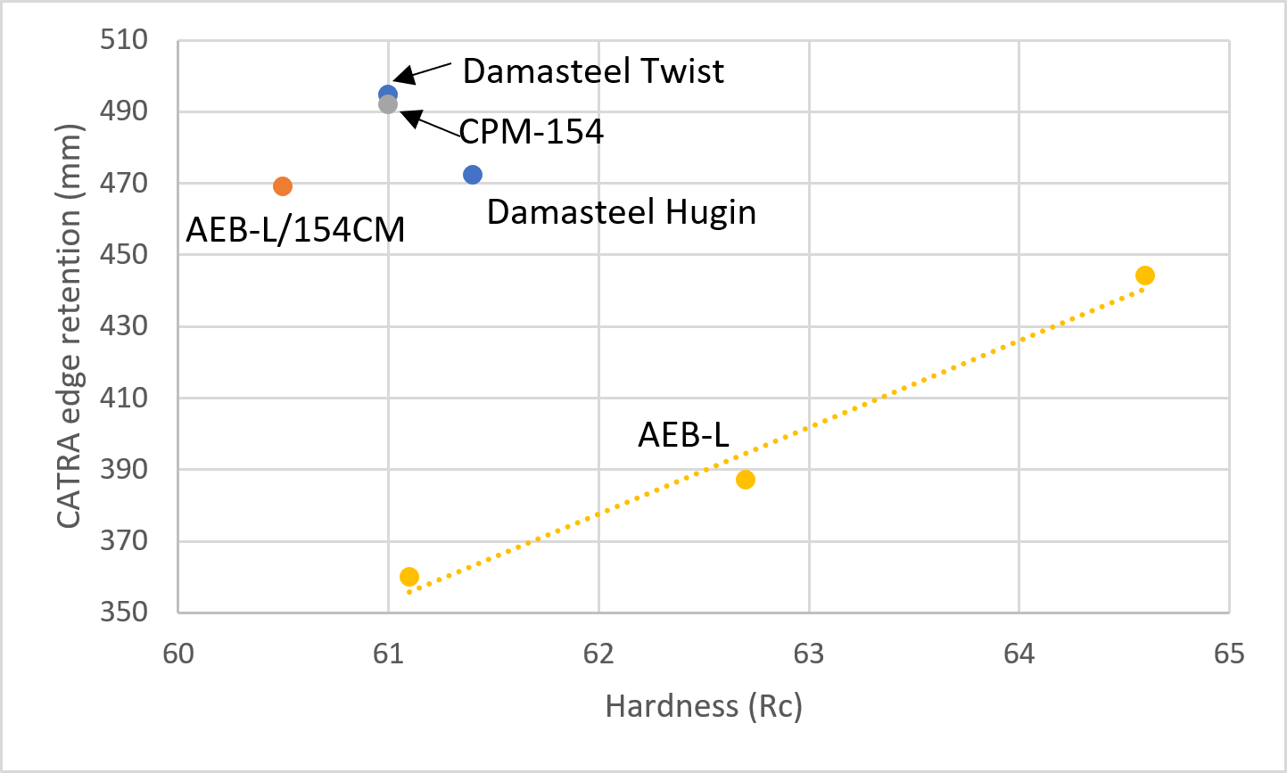 However, when I tested the dense twist the result was largely the same as Hugin. If there was a true increase in performance it is very small. In either case, the edge retention of the Damasteel is very close to CPM-154 (the same as RWL34), despite the presence of a large amount of PMC27 with much less wear resistance (similar to AEB-L on the chart below). Therefore the ladder patterning leads to a significant boost in edge retention.