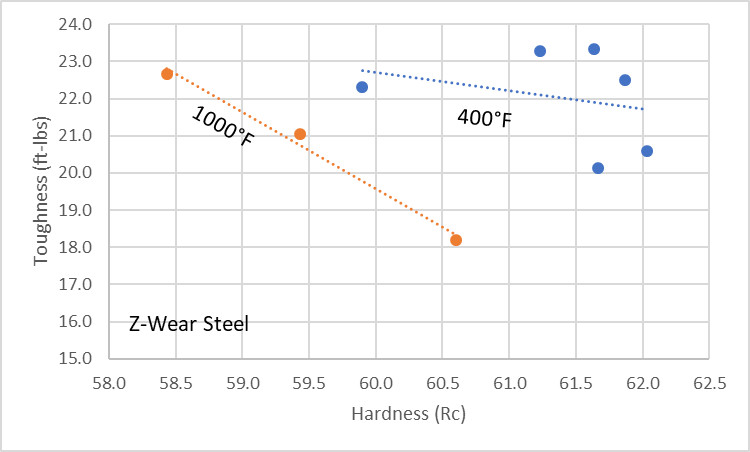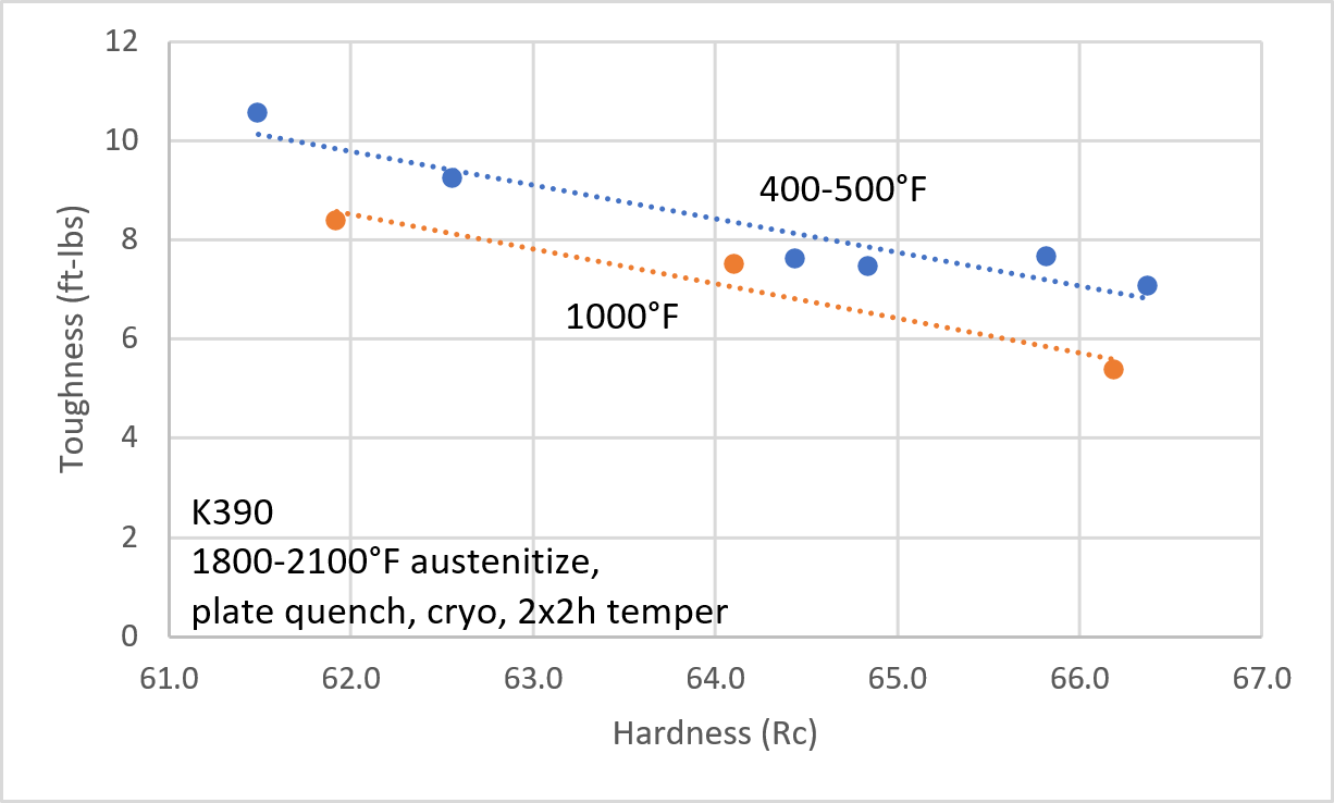 The 400-500°F tempering led to a similar hardness-toughness balance (blue dots and line), while the 1000°F temper led to a lower hardness-toughness balance. So we found a similar result to the prior comparisons we have made between low and high tempering with CPM-CruWear and CPM-10V where a low temper at 400°F led to better toughness for a given hardness.