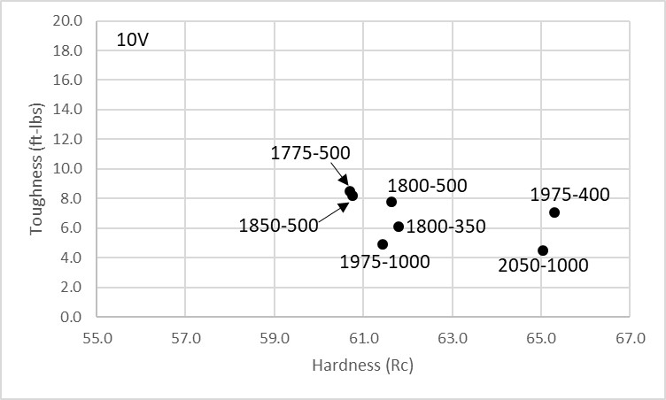 We must remember, however, that the 1000°F temper led to lower hardness for a given austenitizing temperature, so it can be better to plot toughness against hardness instead so that we can see which heat treatments led to the best balance of hardness and toughness: