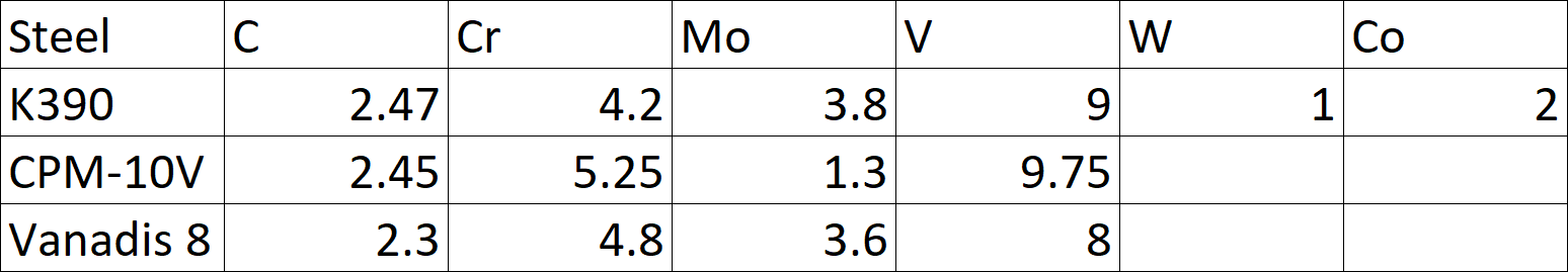 I already have a video and article about the history and properties of K390, which you can see here. K390 is a powder metallurgy non-stainless steel with high wear resistance due to very high vanadium, 9%. It is in a similar category to CPM-10V and Vanadis 8.