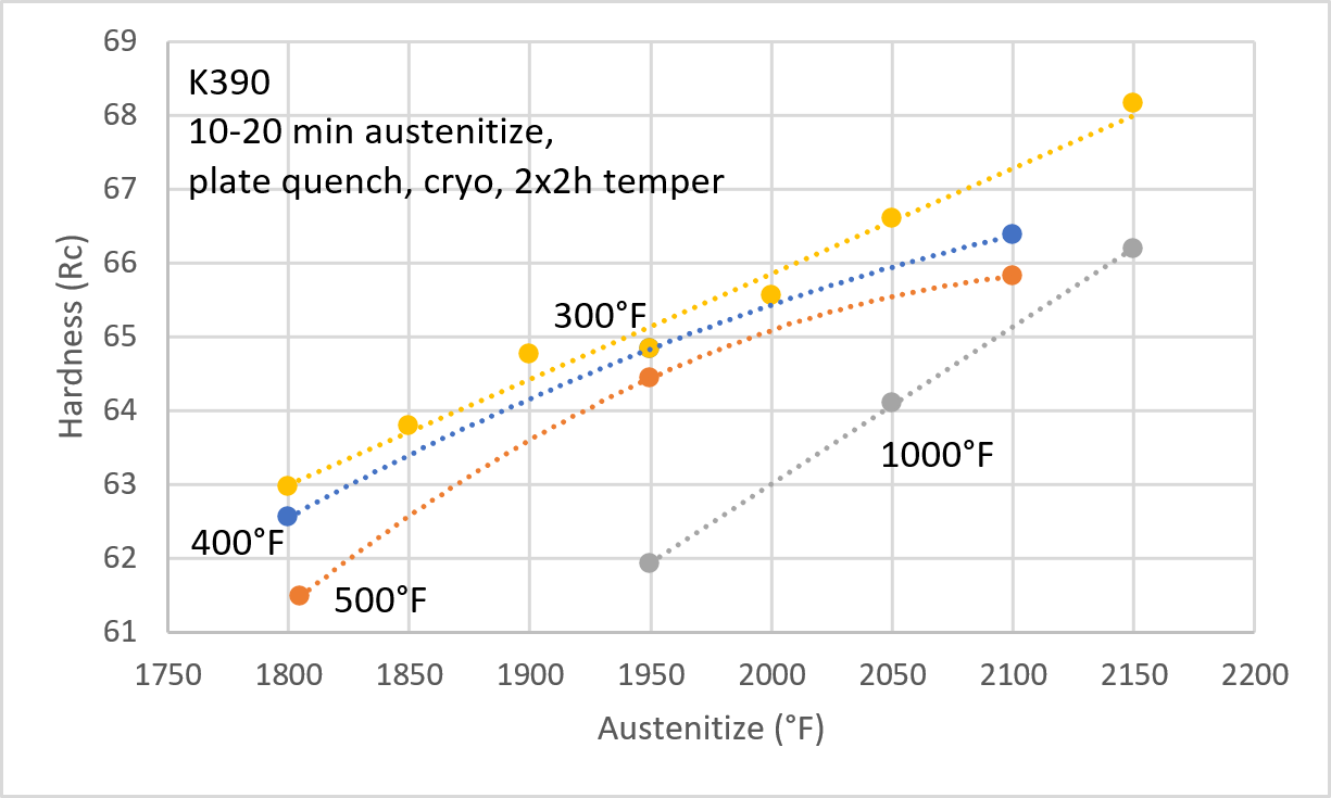 Set the desired hardness by selecting the appropriate combination of austenitizing and tempering temperature using the chart earlier in this article. Of course your batch of K390 and your furnace, cooling rate, etc. may yield slightly different results.