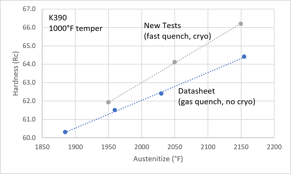 The time at the high austenitizing temperature was fixed at 20 minutes for the tests that I did (bottom of the table), but Chaushev used 15 minutes for 2050°F/1120°C and 10 minutes for 2100-2150°F (1150-1175°C). The K390 datasheet recommends 20-30 minutes for 1030-1150°C (1885-2100°F) and 10 minutes for 1180°C (2150°F). Shorter hold times are used at high temperature because carbides dissolve more rapidly at high temperature, and grain growth can be a concern. Chaushev used an oil quench while I did a plate quench in my tests; both are relatively fast quenching methods.