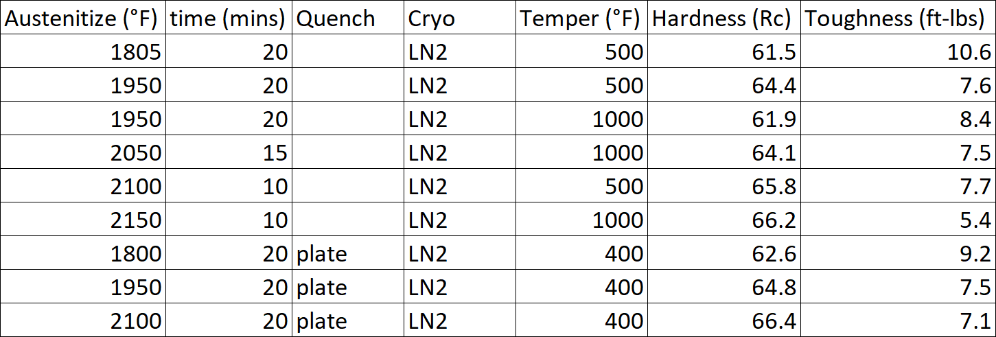 We didn’t test without cryo treatments, the maximum recommended austenitizing temperature is likely lower without cryo (when using the recommended 400-500°F temper).