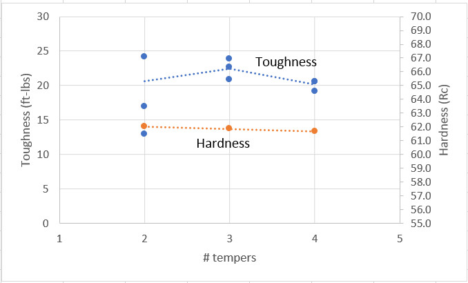 1. A “low” temper of 400°F led to a better balance of hardness and toughness than a “high” temper of 1000°F.