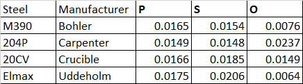 Common impurities in steel include sulfur (S), phosphorus (P), and oxygen (O). My testing found P and S to be similar among the manufacturers, but oxygen content to be somewhat lower for Bohler and Uddeholm, Carpenter to be the worst, and Crucible in the middle: