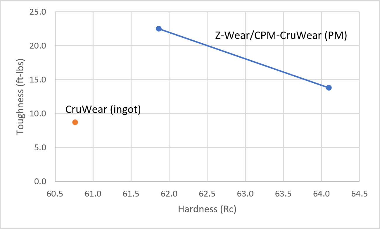 3. The powder metallurgy versions, Z-Wear and CPM-CruWear, have significantly better toughness than the conventional version, CruWear. This is due to the finer microstructure from powder metallurgy.