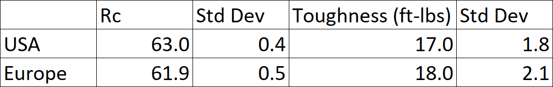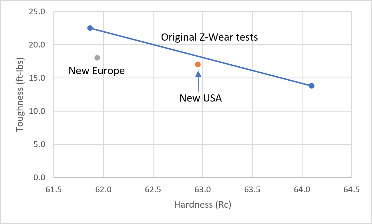 The new USA material tests roughly fall on the same trendline as the previous Z-Wear testing, while the new European material falls a bit below the trendline. I believe this is likely due to the small composition differences, or perhaps a difference in annealing (resulting in a different response to the same heat treatment). I would consider these materials to be basically equivalent.