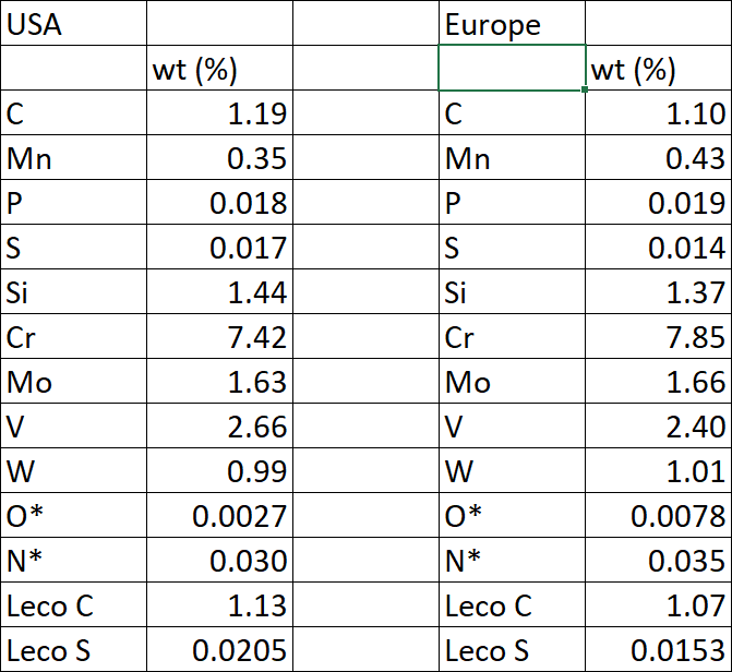 The USA version ended up 1 Rc harder but one ft-lb lower in toughness. I didn’t get any one-off low toughness coupons that would suggest that one version or the other has large carbides or inclusions leading to lower toughness. The standard deviation of the toughness of the European version was slightly higher, but that could just be random, plus higher toughness coupons tend to have a bigger spread than low toughness coupons, so I wouldn’t read anything into that. To determine the reason for the higher hardness of the USA version I measured the composition of the two using OES (optical emission spectroscopy) along with combustion. Combustion tested carbon, sulfur, nitrogen, and oxygen. OES cannot test oxygen, and the carbon and sulfur values from combustion is somewhat better than OES, so both are presented in the table (listed as LECO C or LECO S at the bottom).