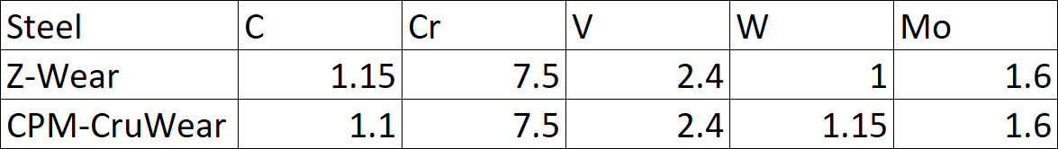 As a side note, I found this austenitizing temperature of 2140°F to be too high leading to inflated toughness, which you can read about here. Also the reported finer powder size did not lead to an obvious difference in carbide size: