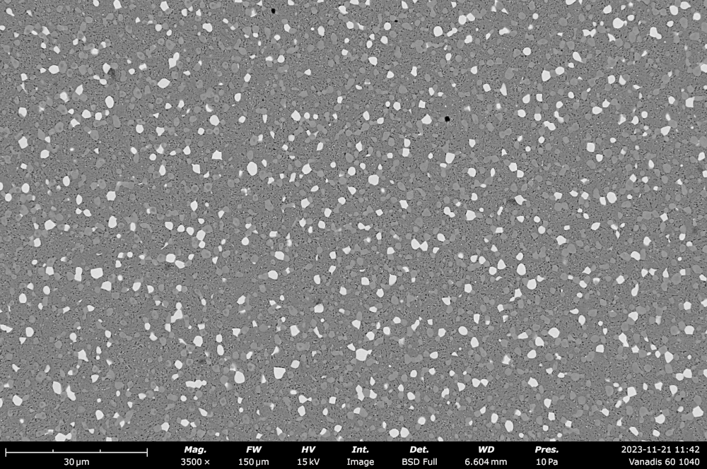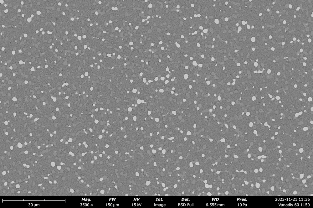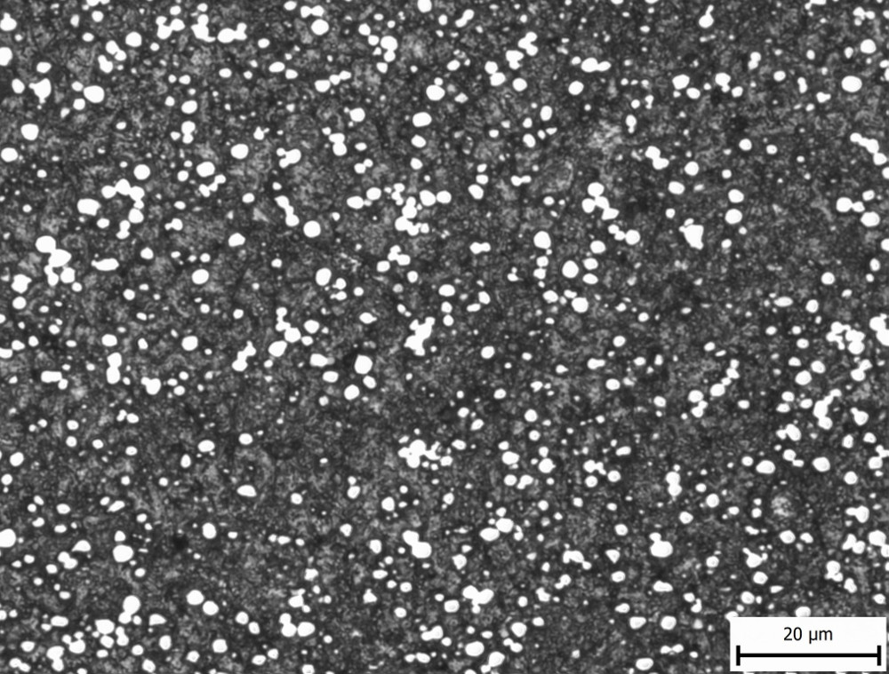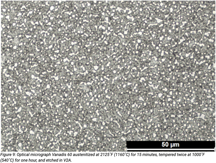 Malachi also took scanning electron microscope (SEM) micrographs of Vanadis 60 austenitized at 1900 and 2125˚F using the “backscatter” imaging technique where contrast is partially generated from composition differences within the sample. Heavier elements scatter more electrons back into the detector leading to bright areas. Thus vanadium carbides show up as grey while the tungsten/molybdenum carbides are white, due to the relative atomic weights of the carbide forming elements (V < Mo < W).