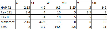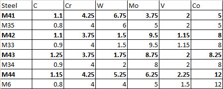 Another development occurred in the early 1960s when it was discovered that greater control over carbon content and cobalt addition could be used to make high speed steels that could be heat treated to 70 Rc. Several steels were patented within only a few years by different companies, with the most common being VASCO Hypercut patented in 1963, given the standard designation M42. You can read more about the history of these steels in this article. The compositions of these steels are shown in bold, and the older lower carbon versions of each are shown below each of the bold compositions in the “M40” series.