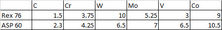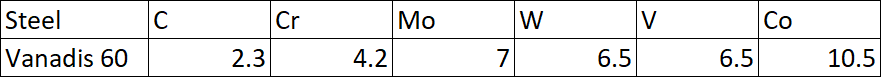 As mentioned above ASP 2060 (Erasteel) and Vanadis 60 (Uddeholm) are identical in composition. They have molybdenum and tungsten (and to a lesser extent chromium adn vanadium) added for “hot hardness,” the ability for a steel to maintain its hardness at high temperatures. This is important for machining operations where the tools are run at “high speed” and thus heat up due to friction. Hot hardness is created through a phenomenon called “secondary hardening” where the precipitation of very tiny carbides causes the steel to further harden when tempering at high temperatures, which you can read about in this article. The vanadium content of Vanadis 60 is relatively high at 6.5% for wear resistance. Cobalt is added to further improve hot hardness by affecting how the carbides form in secondary hardening (as opposed to forming carbides such as molybdenum and tungsten). You can read more about cobalt in this article.