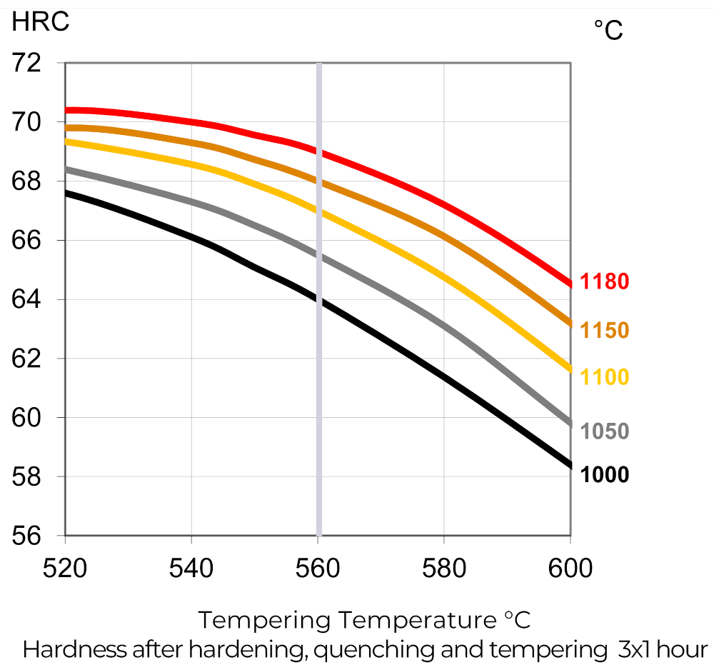 The ASP 2060 datasheet has a better heat treatment hardness chart than the Vanadis 60 datasheet so I have included it below: