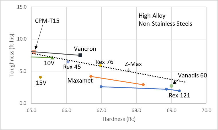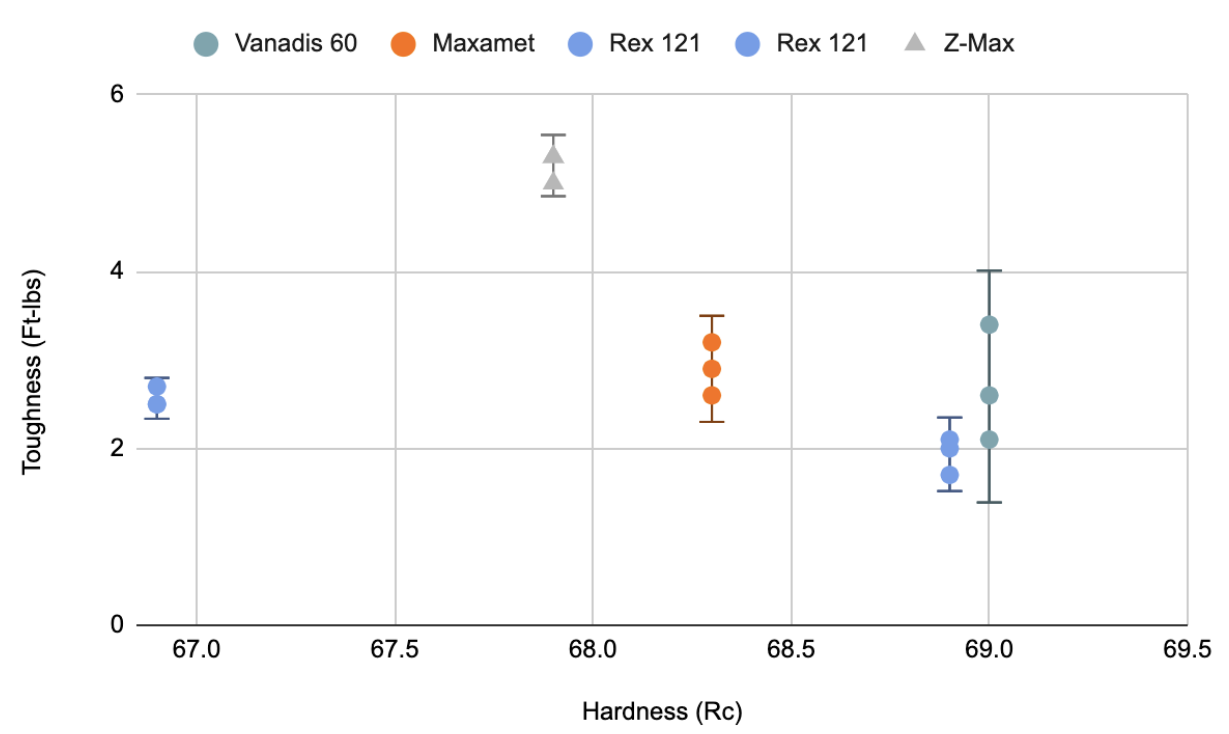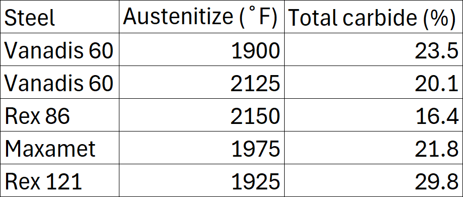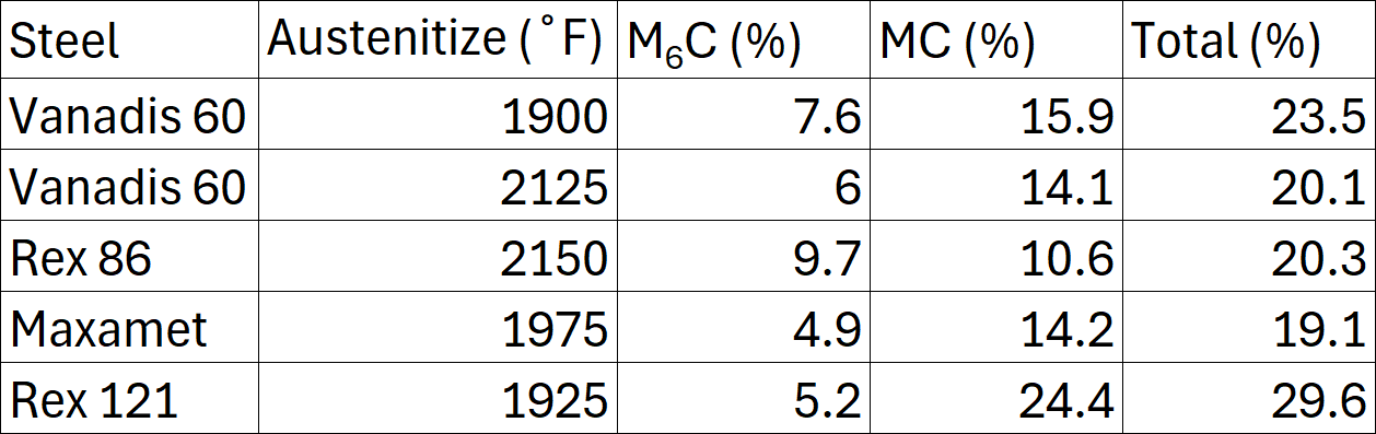 So based on total carbide volume alone we would expect Maxamet to have the highest toughness (it has the lowest carbide volume), followed by Rex 86, Vanadis 60, and finally Rex 121. Maxamet and Vanadis 60 have similar MC content but Vanadis 60 has higher M6C, so we would expect Vanadis 60 to have higher wear resistance than Rex 76, Rex 86, and Maxamet, but less than Rex 121.