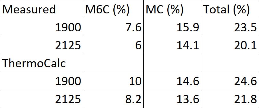 You compare the results you get with predictions based on thermo-calc. Did you check on the quality of the data that this program uses? I´m pretty sure that for the more common quantities of alloying elements, the basis of the data is good. But for the more uncommon quantities like 10-15% vanadium… Isn´t the basis of thoses thermodynamic data just a refinement of a refinement of something a japanes guy in the 1930s measured using relatively simple methods?