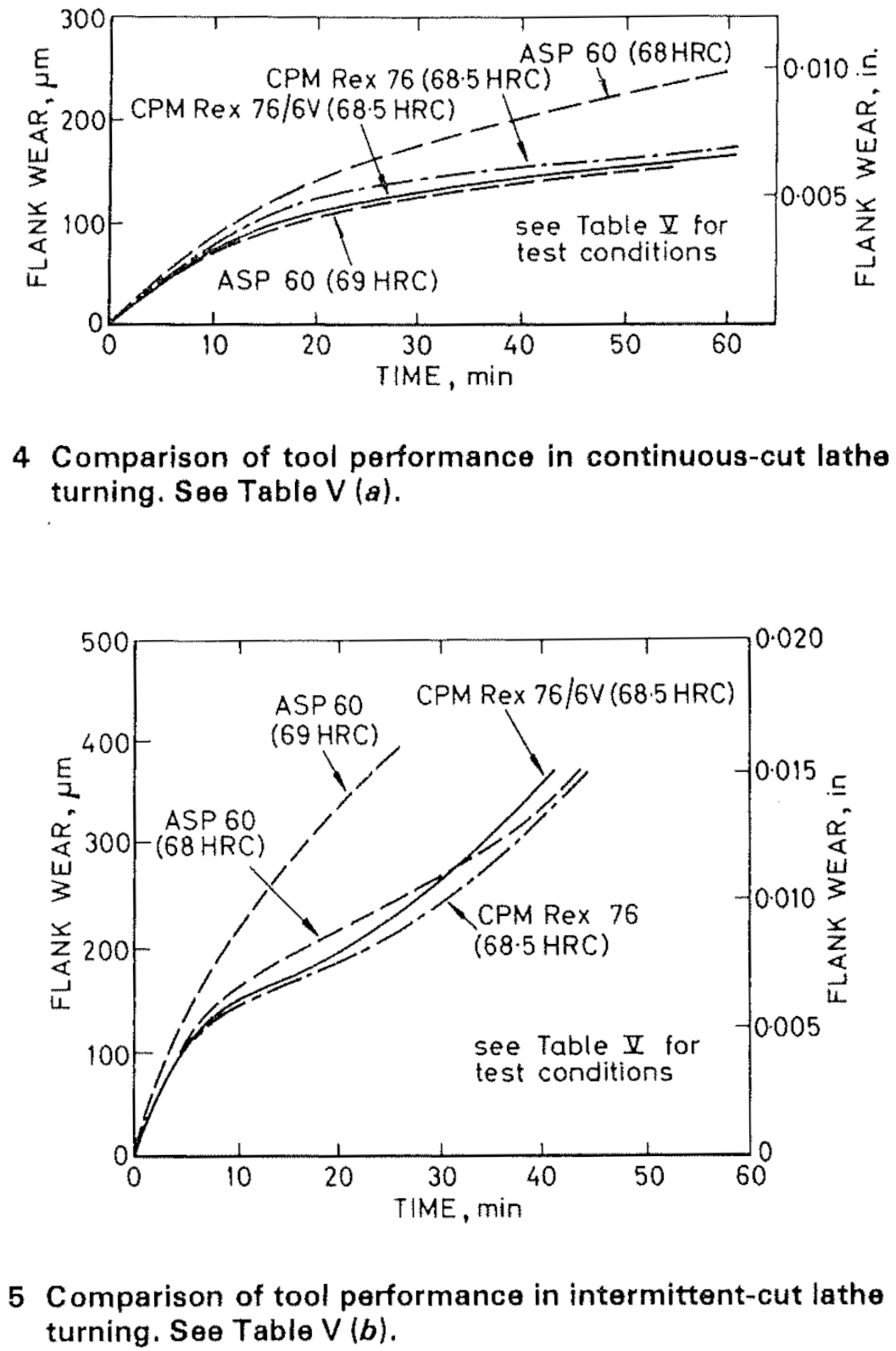 J.H.G. Stake of Uddeholm was not happy with these claims. He said [1], “I represent the firm that sells the steel mentioned which is available commercially, the ASP steels by the ASEA-STORA process. It is very difficult to comment on the slides shown here regarding the comparison between ASP 60, Rex 76, and Rex 76 with 6% vanadium. The main reason is that the trials have been done without any coolant and that is very unusual in commercial application in general practice. We prefer to go to the toolmaking industry and have the trials made there.”