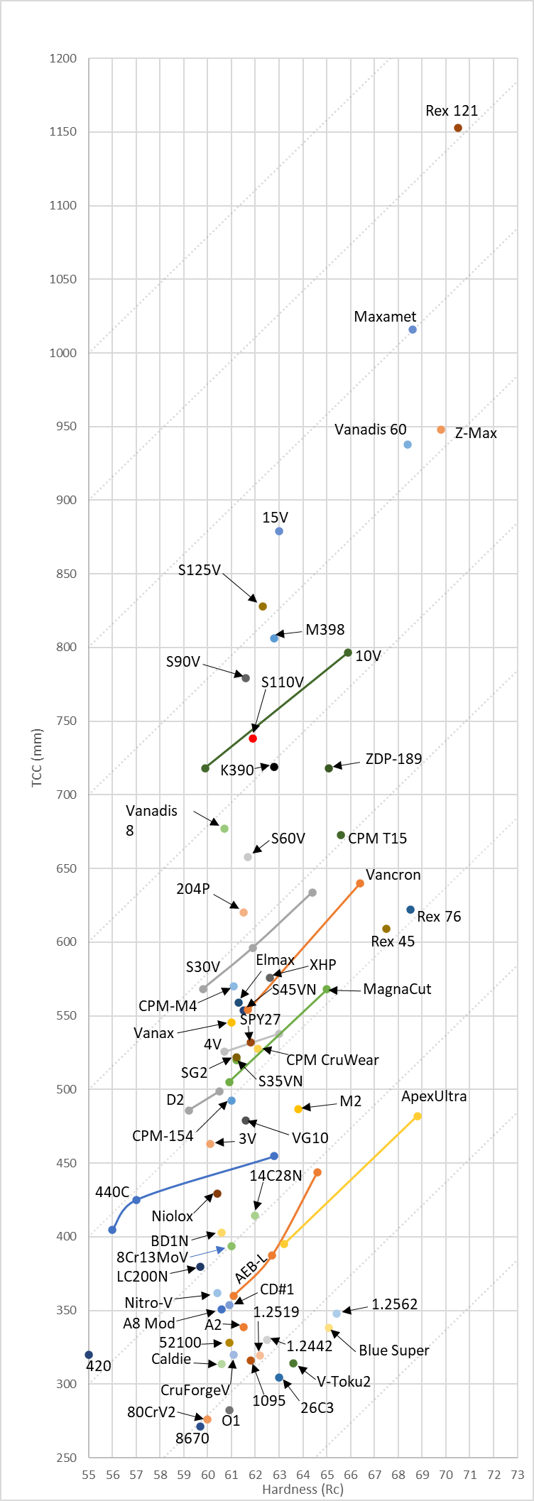 Somewhat surprisingly the resulting edge retention was only slightly higher than Z-Max after compensating for hardness, and was significantly below Maxamet. This was puzzling because Maxamet and Vanadis 60 have similar vanadium and carbon, while Z-Max is somewhat lower in both elements.