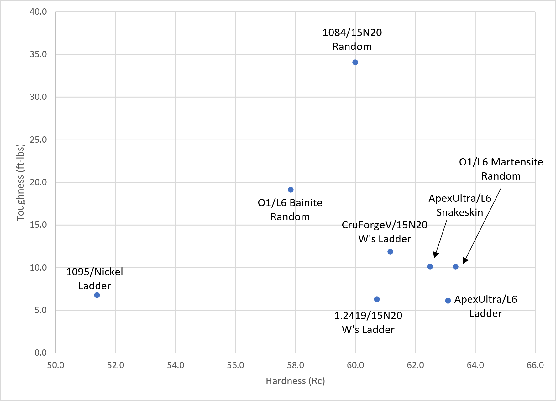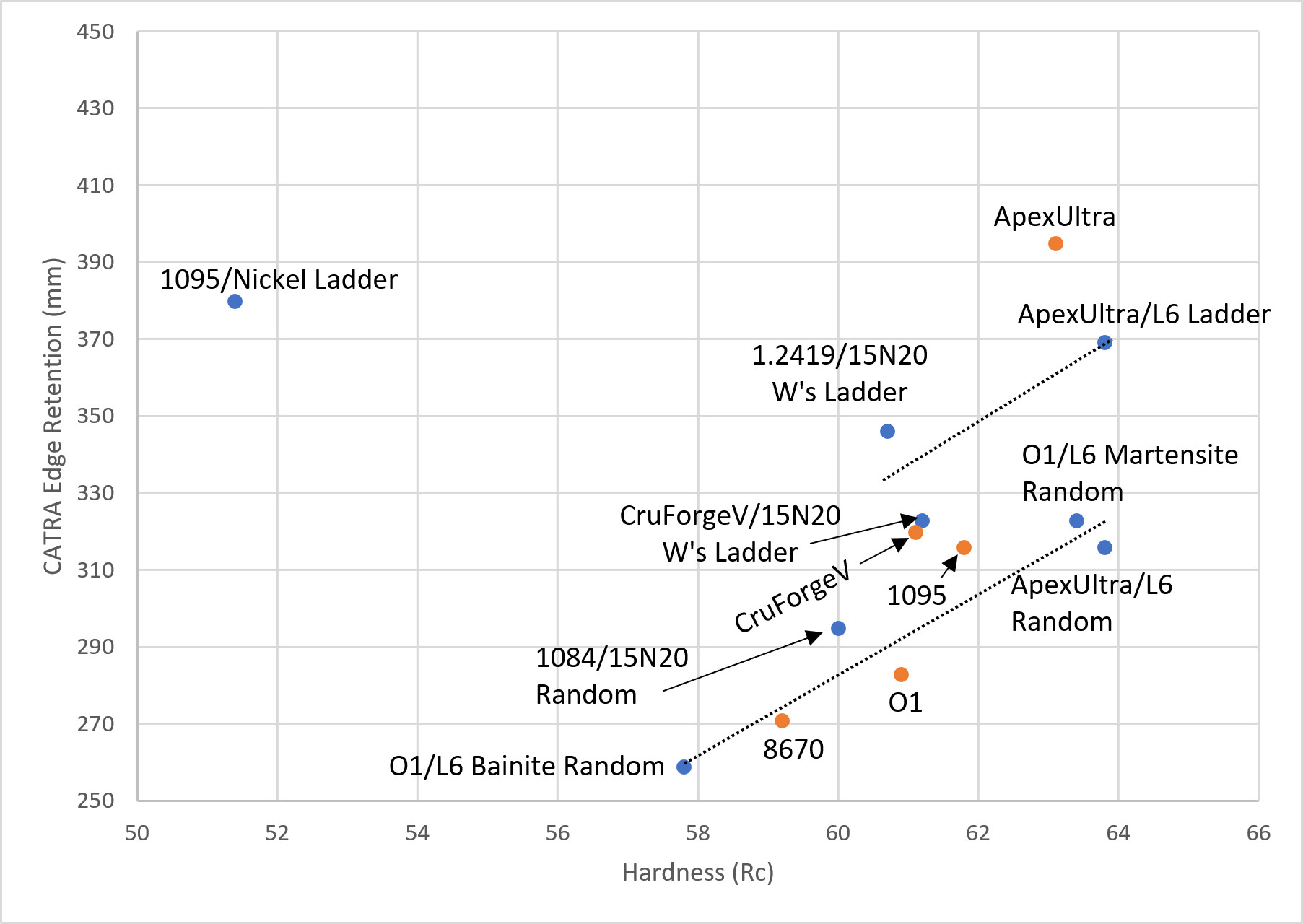 2. High wear resistance steels with high slicing edge retention generally still cut very well even when combined with a steel with lower wear resistance. So combining CruForgeV and 15N20 or ApexUltra and L6 led to edge retention similar to CruForgeV or ApexUltra. However, this was due in part to the improvement in edge retention seen in ladder patterning.