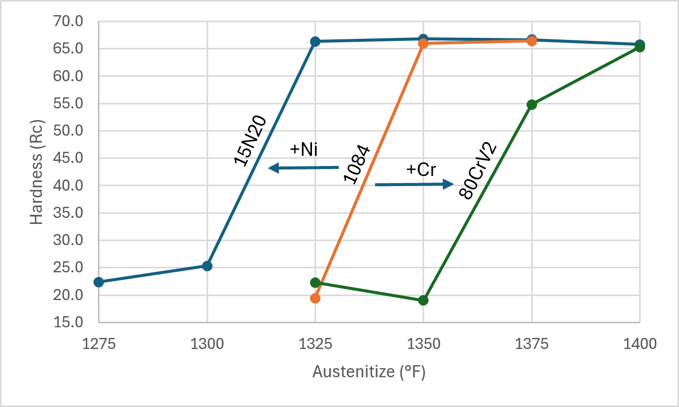 You can see that 15N20 with the 2% Ni addition is fully austenitized (from a normalized, pearlite microstructure) from 1325°F (720°C) while 1084 was still dead soft after quenching from that temperature. The 1084 instead showed full hardness at 1350°F (732°C), only 25°F hotter. 80CrV2 has 0.5% Cr, however, which increases the temperature at which carbide dissolves, and full as-quenched hardness was not achieved until about 1400°F (760°C). This is from a normalized microstructure, not an annealed microstructure. The annealing procedure can have a large effect on heat treating behavior. Below is a chart of 80CrV2 after austenitizing from different temperatures: