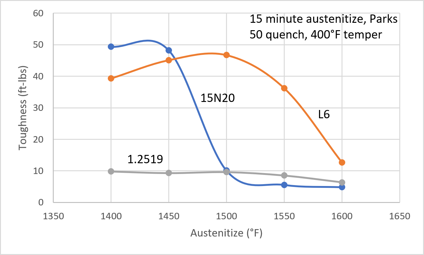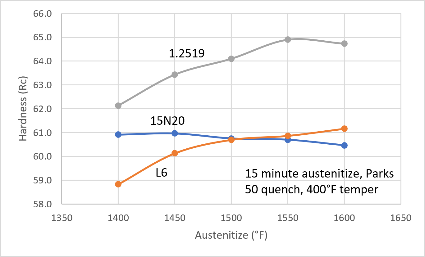 In terms of hardness, the steels behave in ways I have been describing. The L6 and 1.2519 increased in hardness with higher austenitizing temperature. This is because the steels were alloyed with chromium, delaying the dissolution of carbides. 15N20, lacking chromium, was flat in hardness between 1400 and 1600°F.