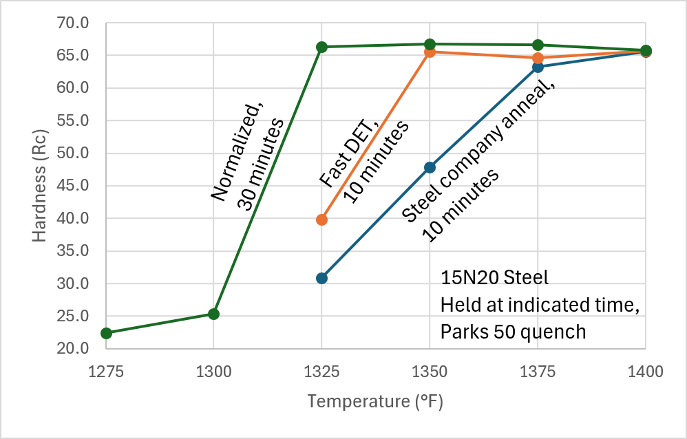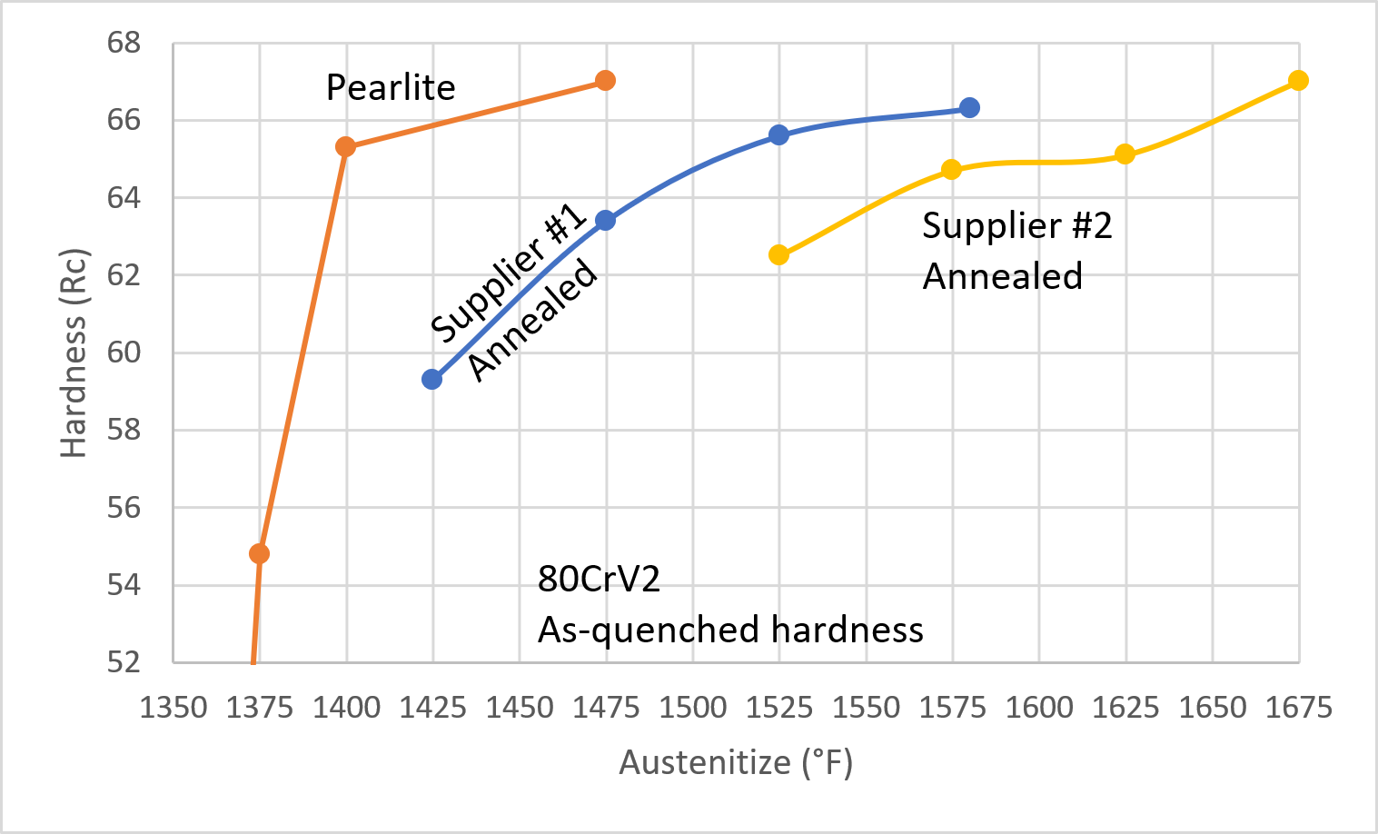 The “Fast DET” anneal was my own annealing procedure with a faster cooling rate. The “Steel company anneal” is the steel as it was received from the manufacturer. You can see that with the steel as-received the peak hardness is not achieved until about 1400°F which is ~75°F higher than a normalized microstructure. But 1400°F is a much lower temperature than was necessary for factory annealed 80CrV2. This helps explain why Cr-free steels are usually austenitized from a somewhat lower temperature such as 1475°F (800°C).