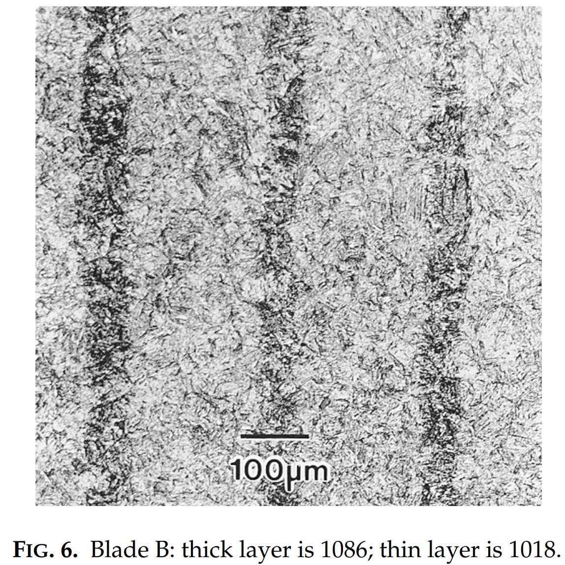 Image from [1]. Notice the higher carbon steel is the “light” layer.