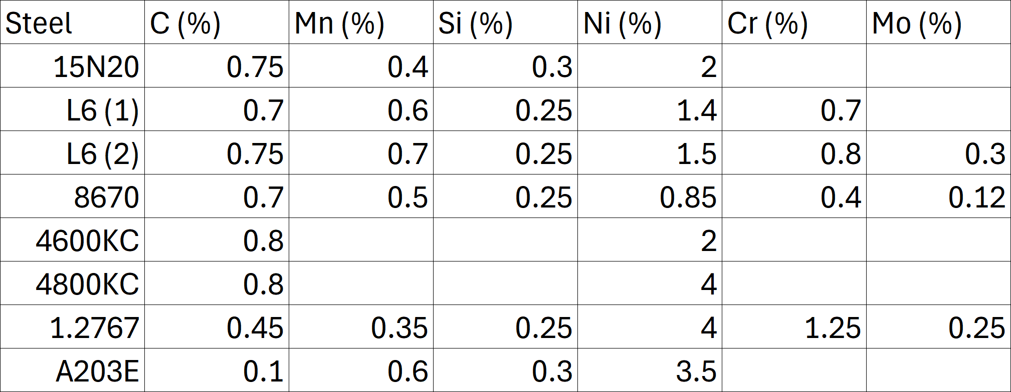 Nickel knife steels. Note: I found conflicting information on 4600 and 4800 compositions so I left the Mn blank. Some list there being 0.5% Mo. The most common versions have little or no carbon, and the “KC” versions have carbon added to them, usually graphite. I have also heard that some distributors take 1080 powder and add nickel powder.