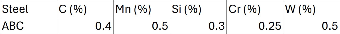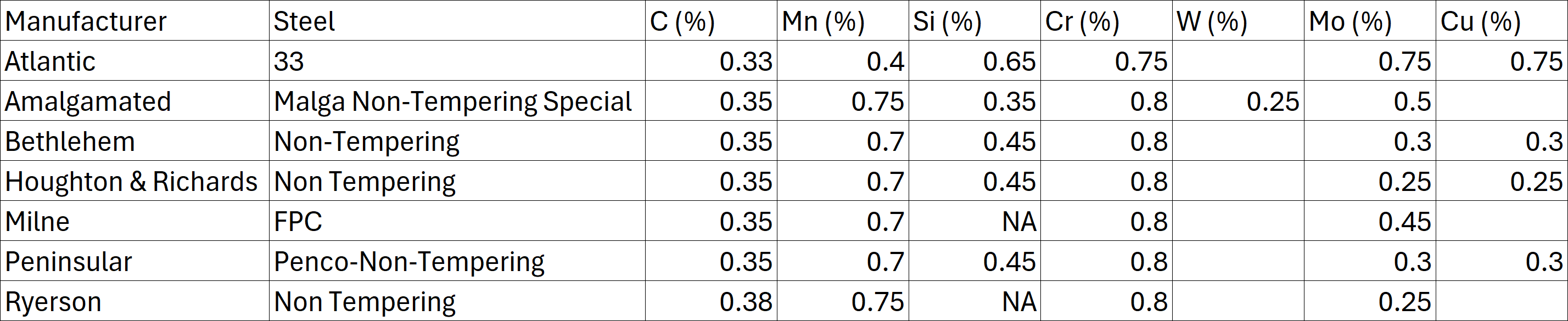 You can see that all are medium carbon, roughly 0.3-0.4%. Each has a chromium addition and either W or Mo (including the original ABC). There is also a Cu addition in some of them. The reason for the copper addition is somewhat of a mystery. Copper additions are not unheard of but are relatively uncommon in low alloy steels, especially back in the 1930s. Copper can help with grain size control from copper precipitates but I have no insight into the 1930s thought process by Atlantic Steel. In any case there were several non-tempering steels without any copper so it does not seem to have been necessary.