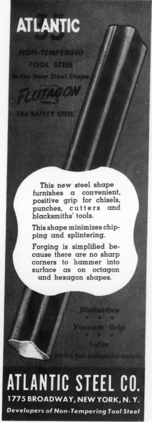 Initially the Atlantic 33 steel was advertised on its own. However, now you often see the steel called “Flutagon Atlantic 33” or “Atlantic 33 Flutagon” and even some people calling it only “Flutagon.” Flutagon was a trademark term by Atlantic steel in 1940 [7] for a new shape of the steel bars they were using that they claimed was more convenient, etc. Because the new shape was advertised for Atlantic 33 the two names became somewhat conflated. However, I think it is better to call the steel “Atlantic 33” and use Flutagon to refer to the shape of the bars instead. After all, the steel is also available in hex bars. Here is a 1941 ad for the new Flutagon shape for Atlantic 33: