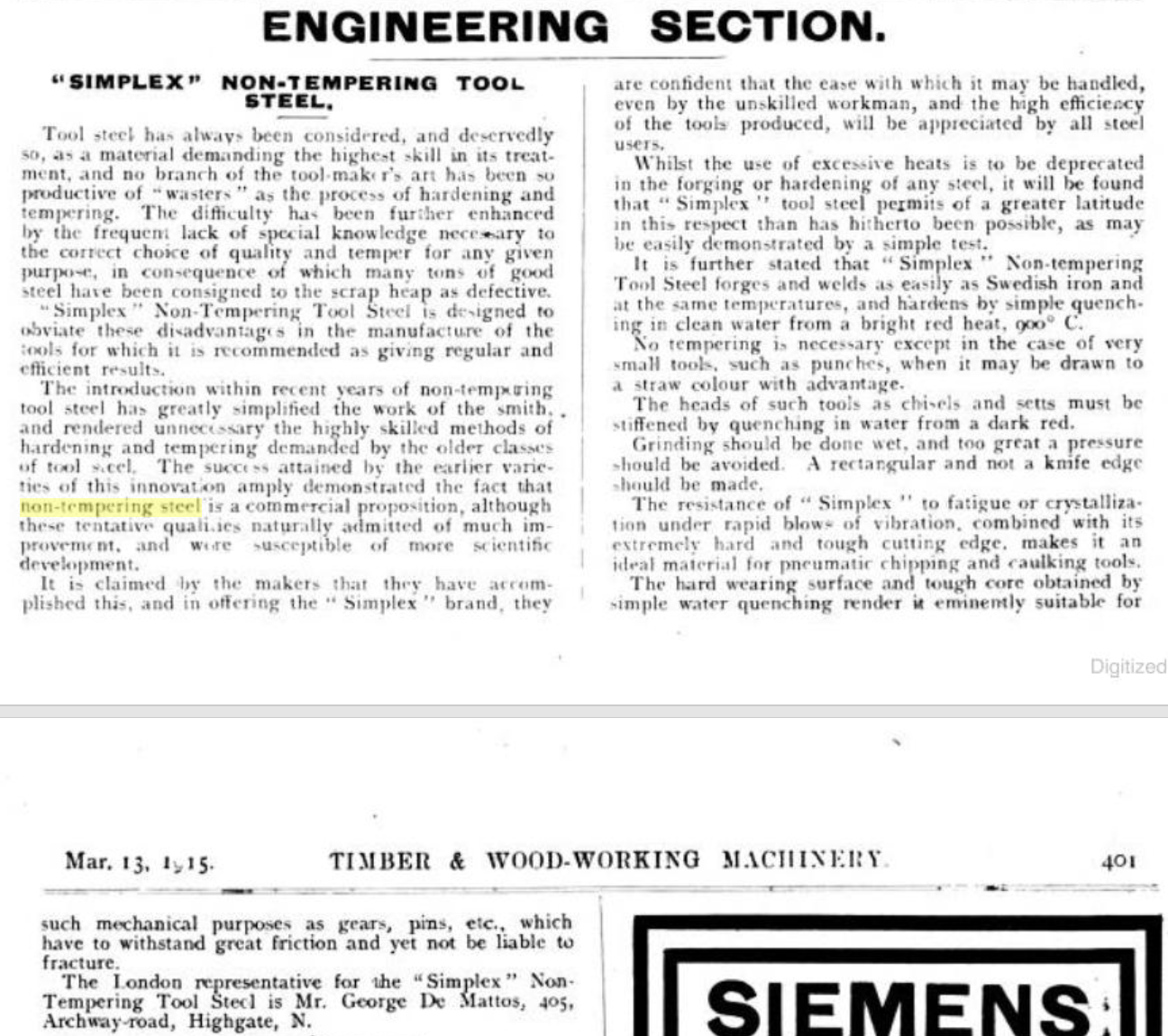 Another early non-tempering steel I found was called Simplex which in 1915 had some advertising which uses a lot of language similar to what we still see for Atlantic 33: