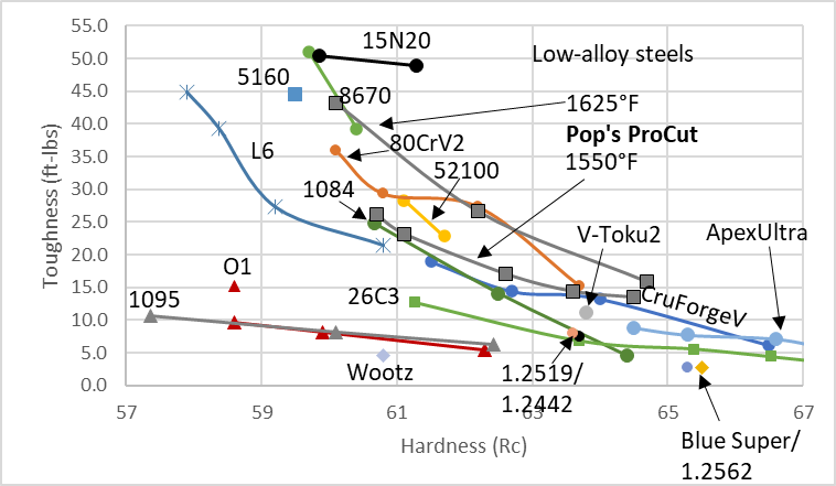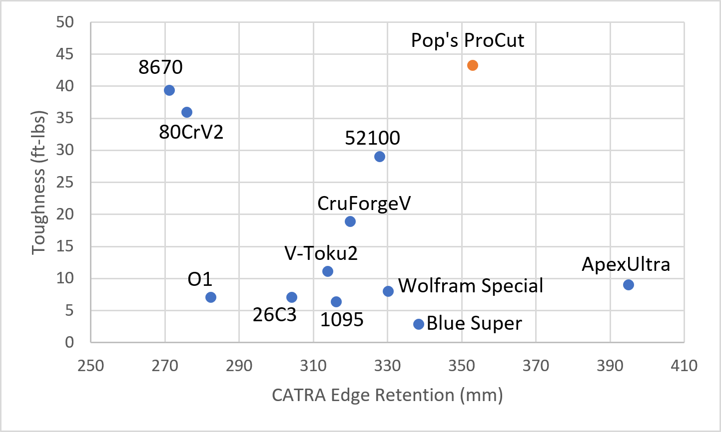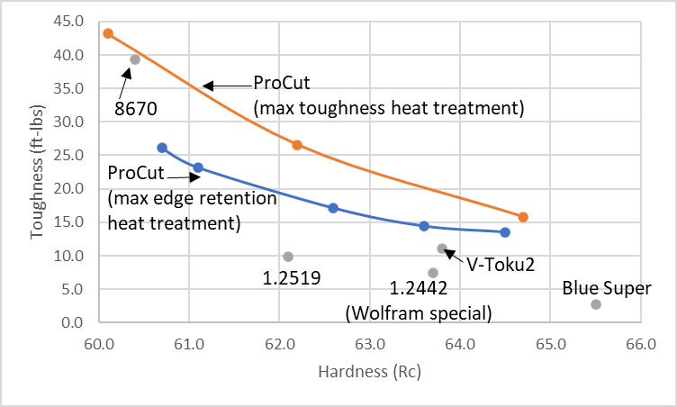 With the high toughness plus the unexpectedly good CATRA numbers the ProCut looks very good compared with other low alloy steel options:
