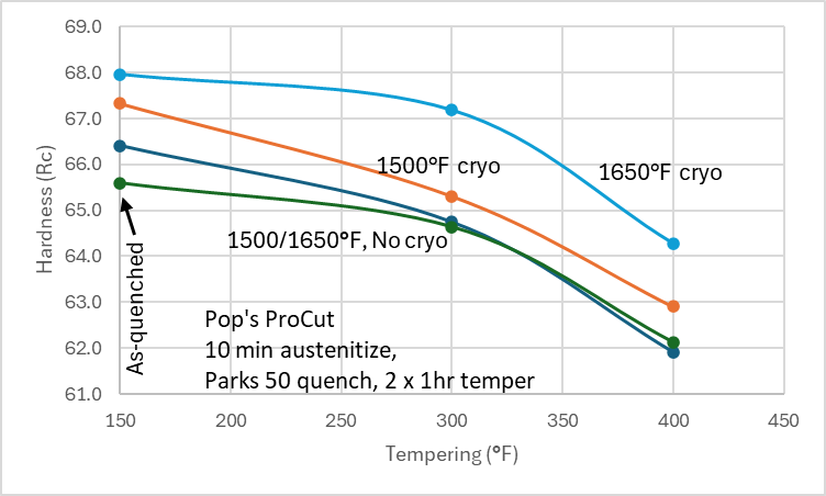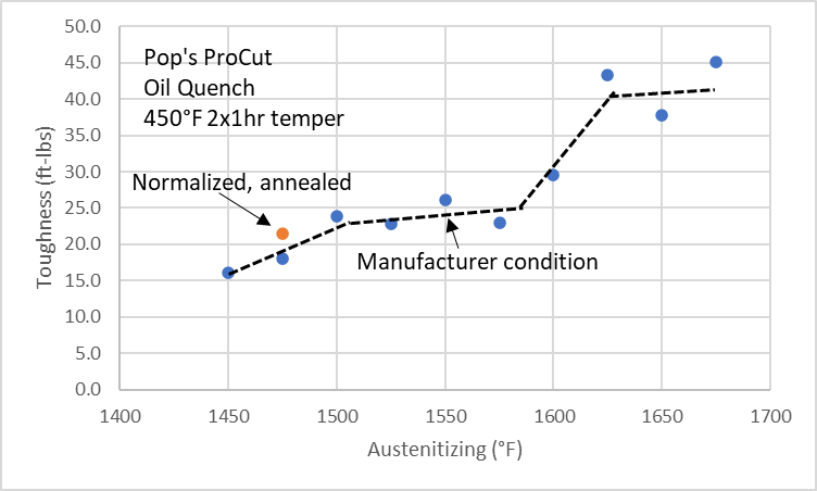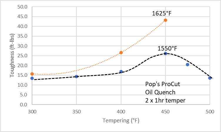 Like many other knife steels, ProCut sees a peak in toughness with a tempering temperature of around 450°F (230°C). Above that the toughness drops due to a phenomena called “tempered martensite embrittlement” which happens in all steels. There is lower toughness with tempering at lower temperatures as well, of course, corresponding with the higher hardness. The behavior of toughness with tempering temperature is roughly similar whether using the higher or lower austenitizing temperature range.