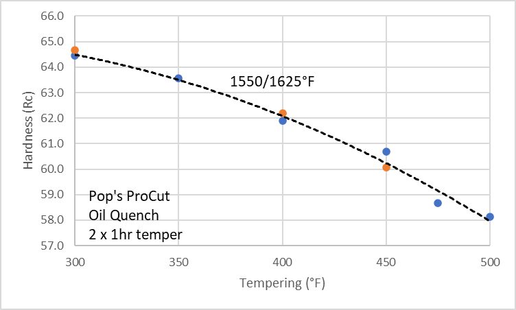 You can see that the hardness is relatively high, still 64 Rc after tempering at 300°F, which is generally as low as I recommend for tempering most any steel. With a 450°F temper the steel is still above 60 Rc.