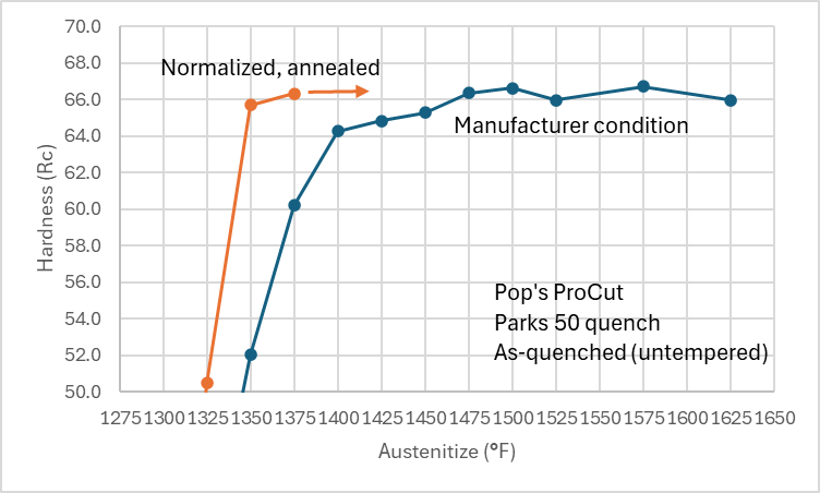 The “hardenability” of ProCut is relatively high, which I also found in testing of 15N20. The high nickel content gives it this hardenability. Air cooling from 1600°F with 1/8″ steel resulted in 60.7 Rc, though from lower temperatures like 1350°F the hardenability is lower (I measured 35.3 Rc). This means that ProCut can be quenched in virtually any quenching oil, even canola, and with relatively thick cross-sections.