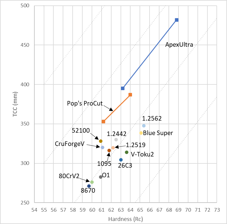 Another exciting new development! Are the TCC/Hardness and Toughness/Edge Retention charts showing the higher or lower heat treatment (and what are the results for the other heat treatment)?