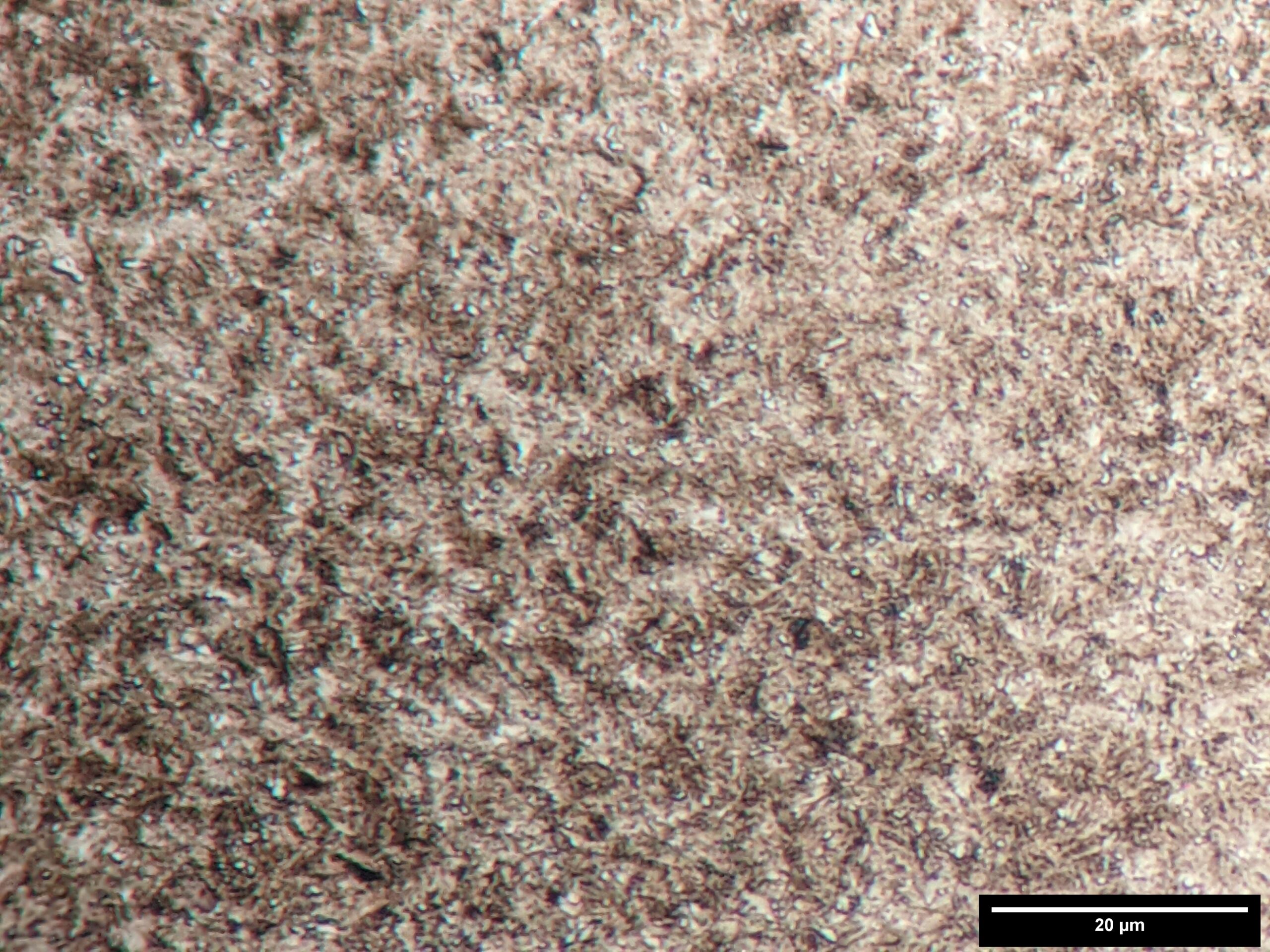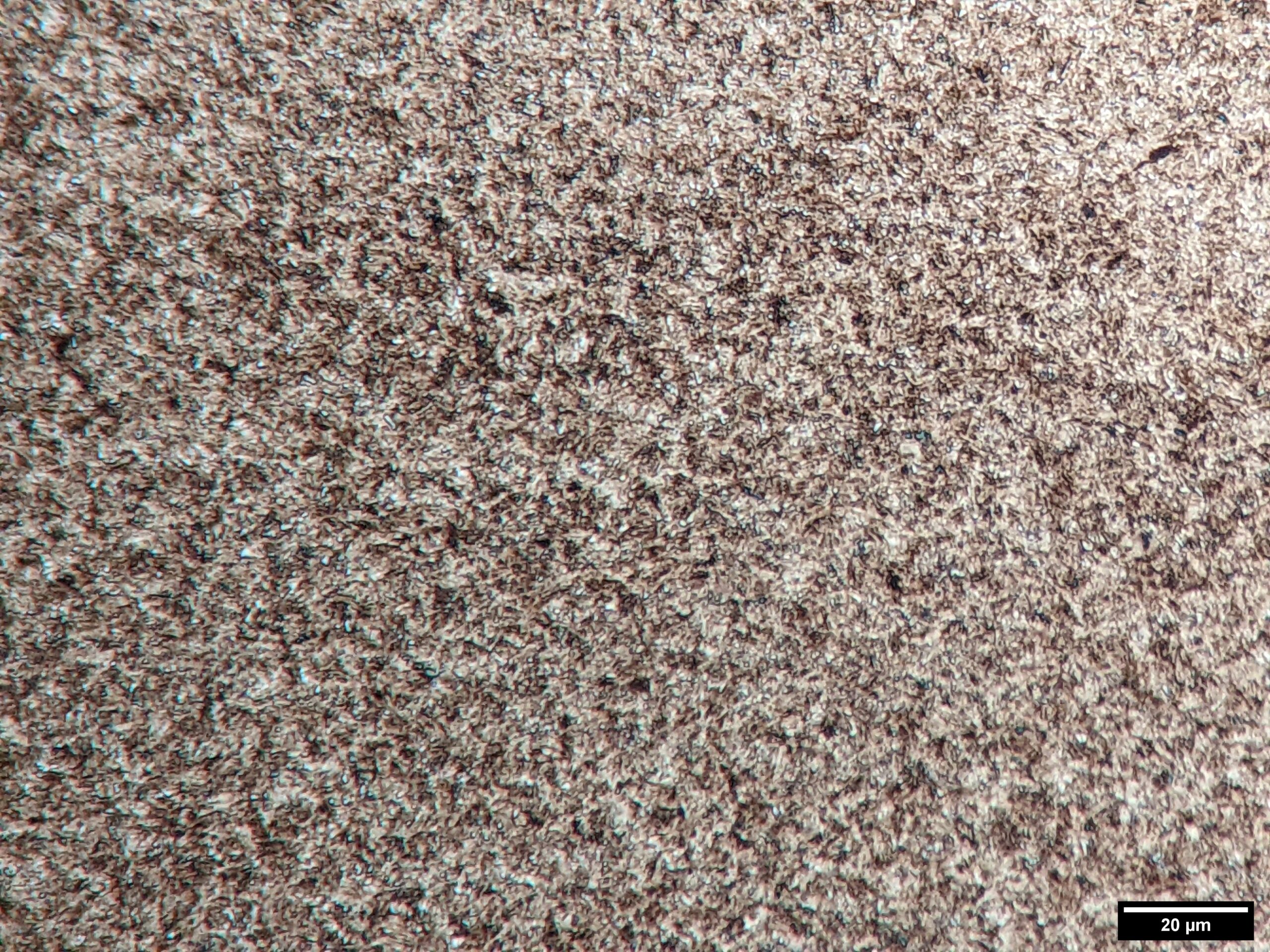 Snapped sample at 50x optical, generally as fine of a snapped sample grain as I’ll see. Steel as delivered, heated to near scale twice, then quenched just before magnetism returns (brine) and a set of thermal cycles following that in an induction forge, and then a pushed heat.