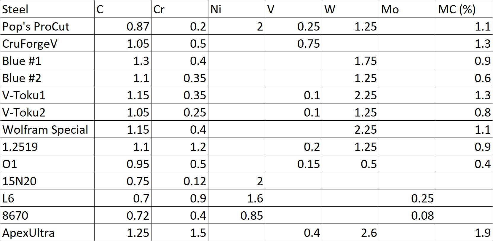 Here is the composition of Pop’s ProCut compared with other grades in its category. The far right column says “MC (%)” which is a calculation of how much total vanadium and tungsten carbide each steel contains after heat treating. One thing you will notice is that since tungsten is a heavy element it does not contribute as much to the MC as you might expect. For example, CruForgeV with 0.75% vanadium has more MC than Wolfram Special which has ~2.25% tungsten. ProCut uses a combination of vanadium and tungsten in a similar fashion to O7 and 1.2519 steels. So it has similar MC to steels like Blue #1, 1.2519/O7, and Wolfram Special, and more MC than Blue #2 and O1. The other nickel nickel steels (15N20, L6, and 8670) of course do not have any MC. These very hard carbides give the steel wear resistance.