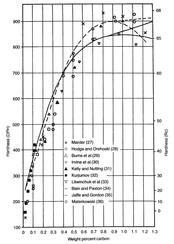 The carbon content is very important to steel properties. One of the best known is the effect of carbon on the resulting as-quenched hardness. The higher the carbon content, the higher the hardness, though it levels out around 0.6% carbon: