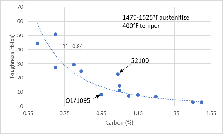 Carbon has an equally strong effect on impact toughness, even when tested at the same hardness for different low alloy tool steels: