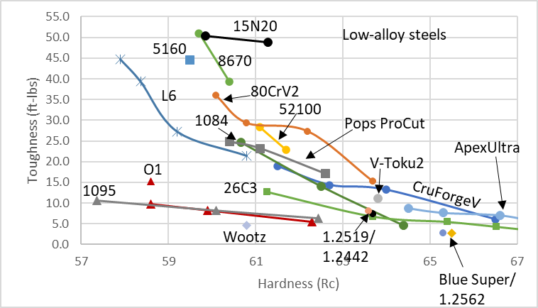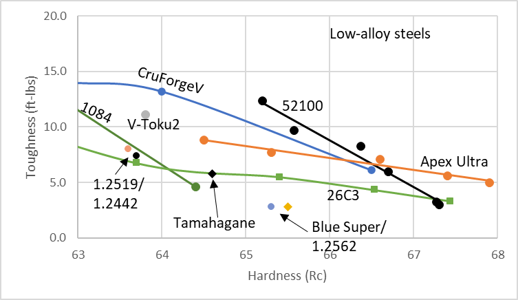 Given the relatively high hardness of 64.6 Rc, the toughness was not chart topping. I measured 5.8 ft-lbs. However, this is a relatively high value for that level of hardness, as you can see when compared against other low alloy steels here:
