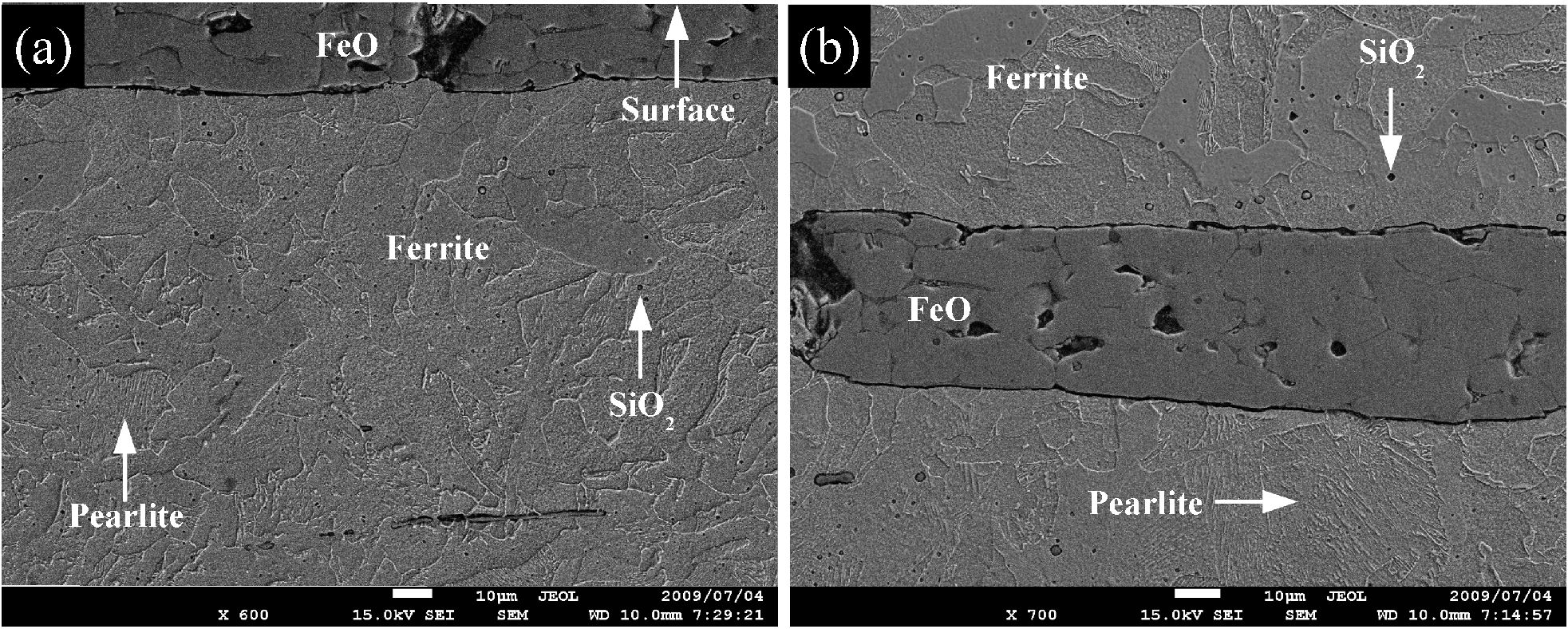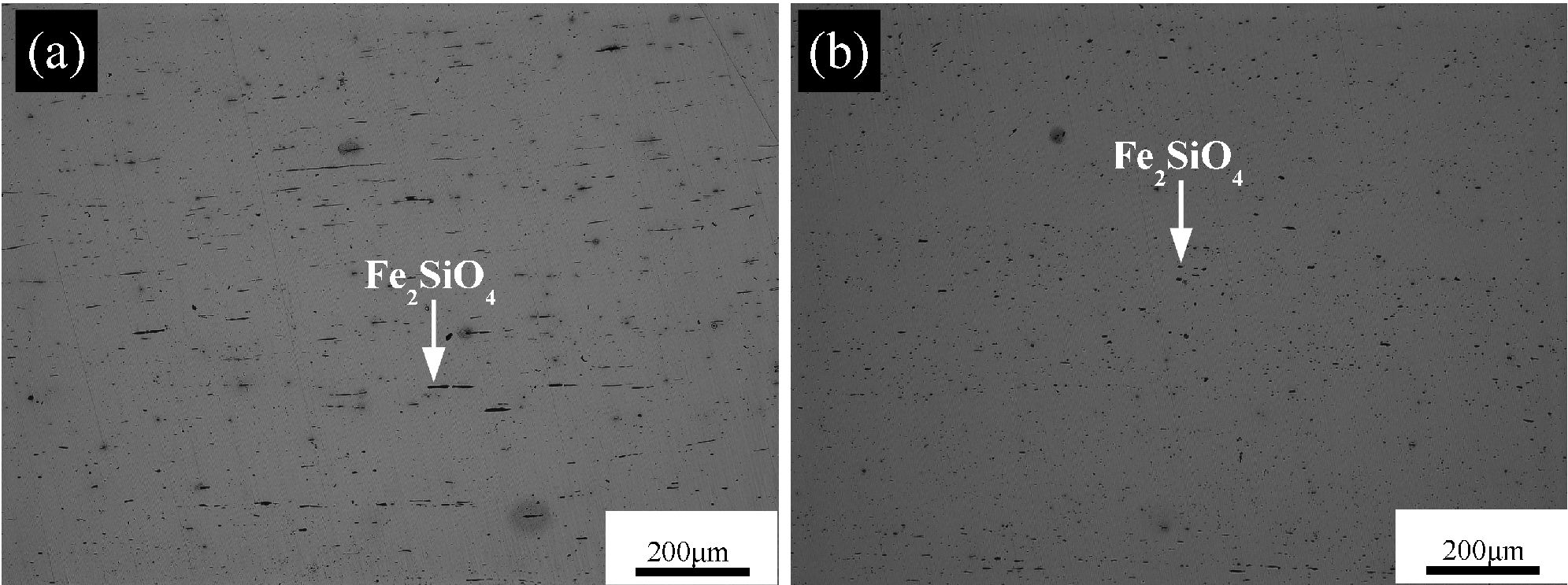One common claim of folding and forge welding is the elimination of inclusions, oxides and slag that are present in the original tamahagane pieces. The researchers found that while bands of FeO were present in A1 and B1 from oxides present in the original pieces, they were not found in A6 or B6. In other words, the FeO bands were eliminated by further forging and forge welding. They were originally present in bands from forge welding flat pieces together. They also found silica (SiO2) and Fayalite (Fe2SiO4) inclusions in the steel. The silica particles were less than 1 micron and the Fayalite inclusions were 16-20 microns in length in the A1 and B1 samples. The thickness of the Fayalite bands was significantly smaller than the FeO, about two microns.