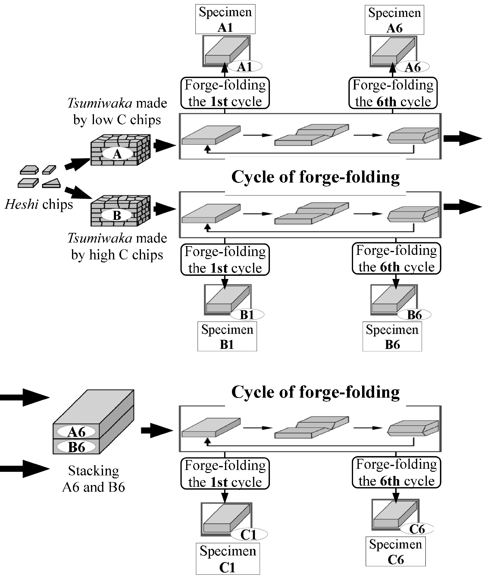 A study was performed along with swordsmith Sadanao Mikami on the effect of forging and folding on impurities and inclusions in tamahagane [10]. The process is shown in the figure below:
