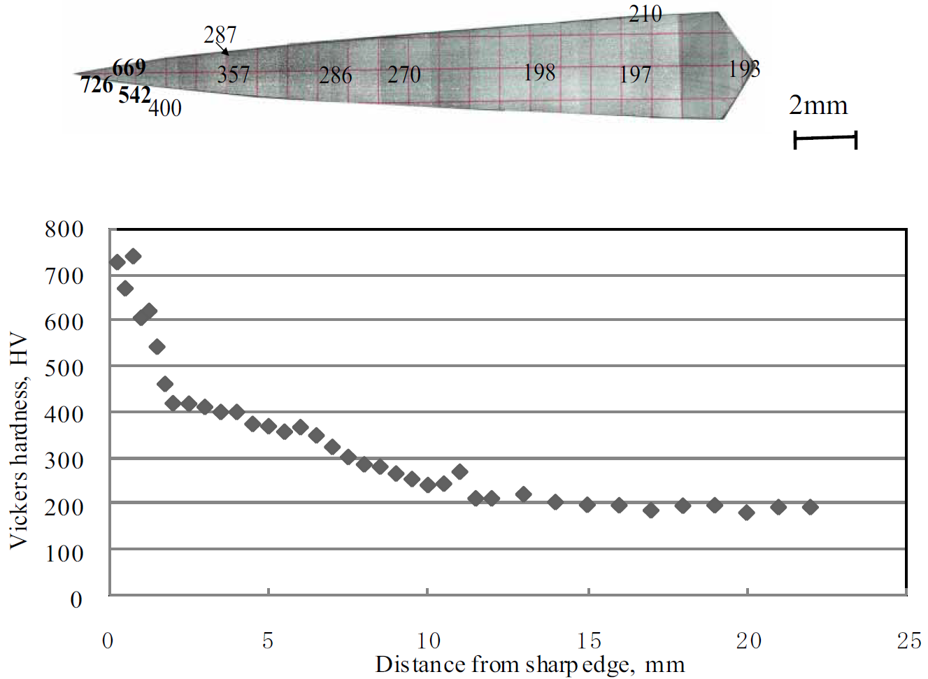 Microhardness of a “Koto” style Japanese blade (before 1596 AD) [3]