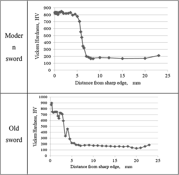 Microhardness from the 1945 and 600 year old swords [9].