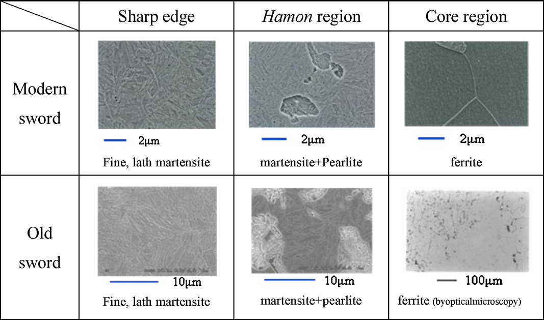 Images of microstructure from a “modern” sword (1945) and an “old” sword (~600 years old) at different locations [9]
