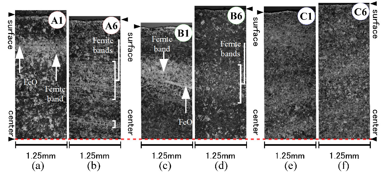 The Fayalite was reduced from 16-20 microns long in the A1/B1 specimens to 14-15 microns in the A6/B6 specimens. These were further reduced to 13.1 microns in the C1 specimens and down to only 8.2 microns in the C6 specimens. So while forge welding and folding did not significantly reduce the volume fraction of Fayalite inclusions, they were reduced in size, more isotropic (round), and more evenly distributed after that process.