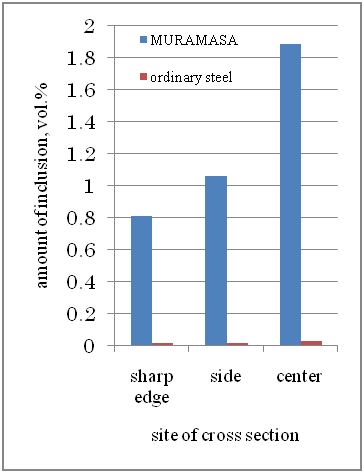 In a study on a kogatana knife produced by Sadanao Mikami had relatively homogenous oxide inclusions in the size range of 5-10 microns [5]. They reported a volume of 4-7% inclusions.