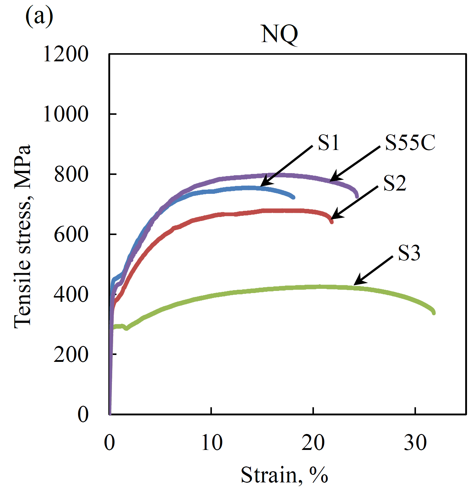 Stress-strain curves and fracture appearance of tamahagane sword steel (S1) and conventional steel (S55C) [2]